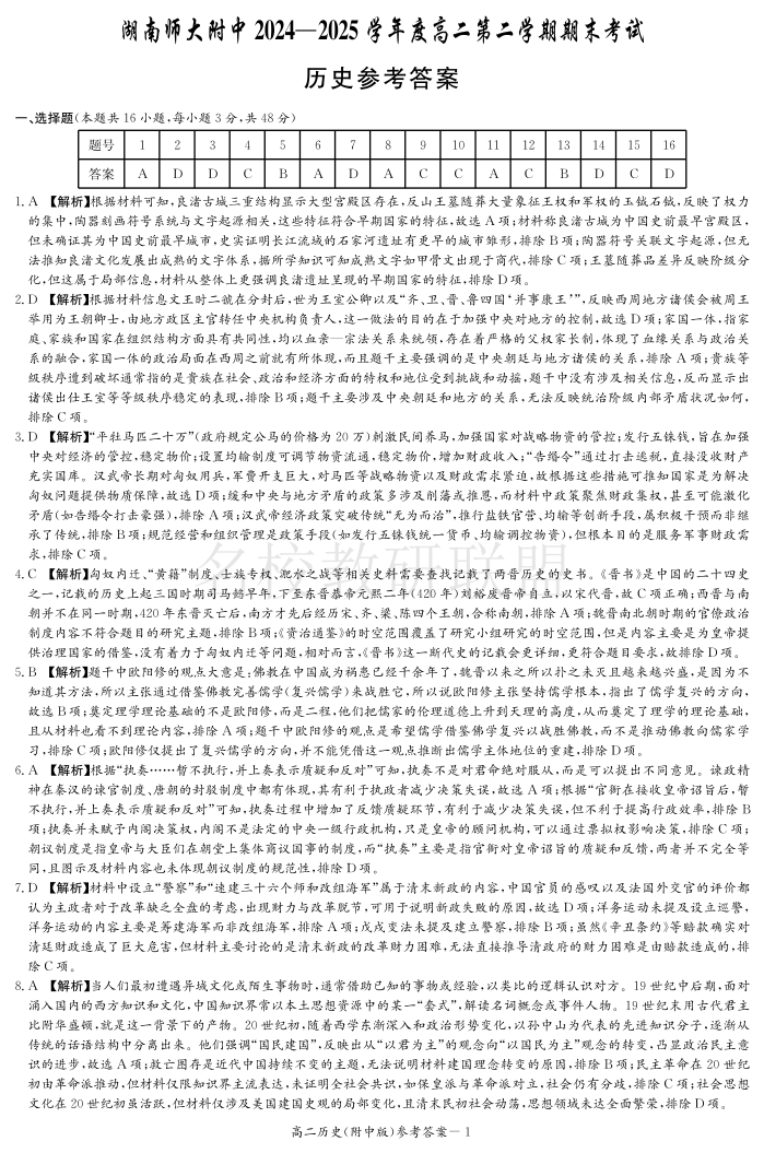 历史答案-湖南师大附中2024-2025高二下期末.pdf