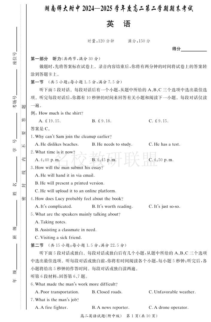 英语试卷-湖南师大附中2024-2025高二下期末.pdf