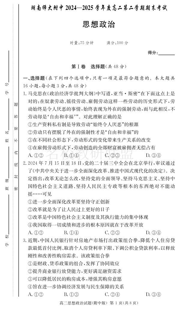 政治试卷-湖南师大附中2024-2025高二下期末.pdf