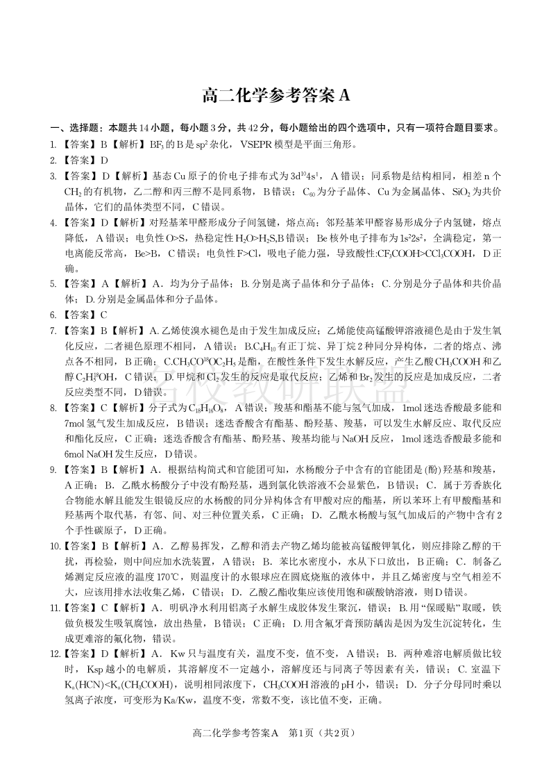 化学试题卷A -高二下7月期末联考答案 .pdf