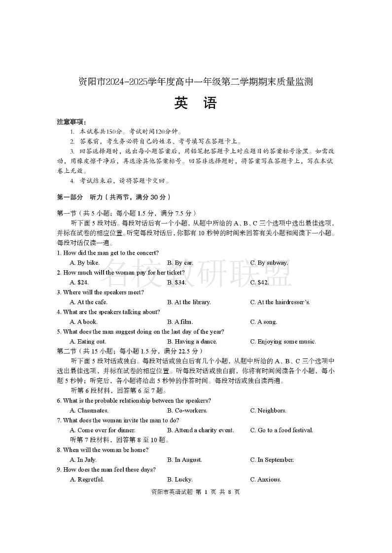 四川省资阳市2024-2025学年高一下学期期末质量监测 英语试卷(含答案).pdf
