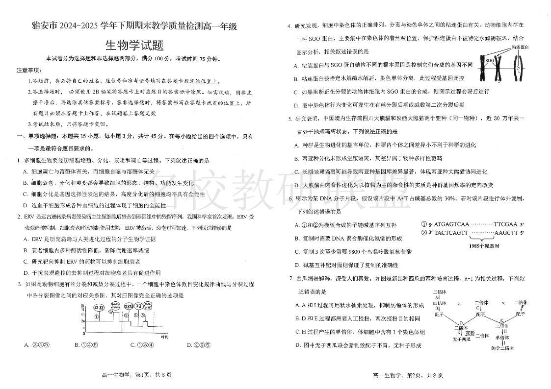 四川省雅安市2024-2025学年高一下学期期末教学质量检测 生物试卷(含答案).pdf