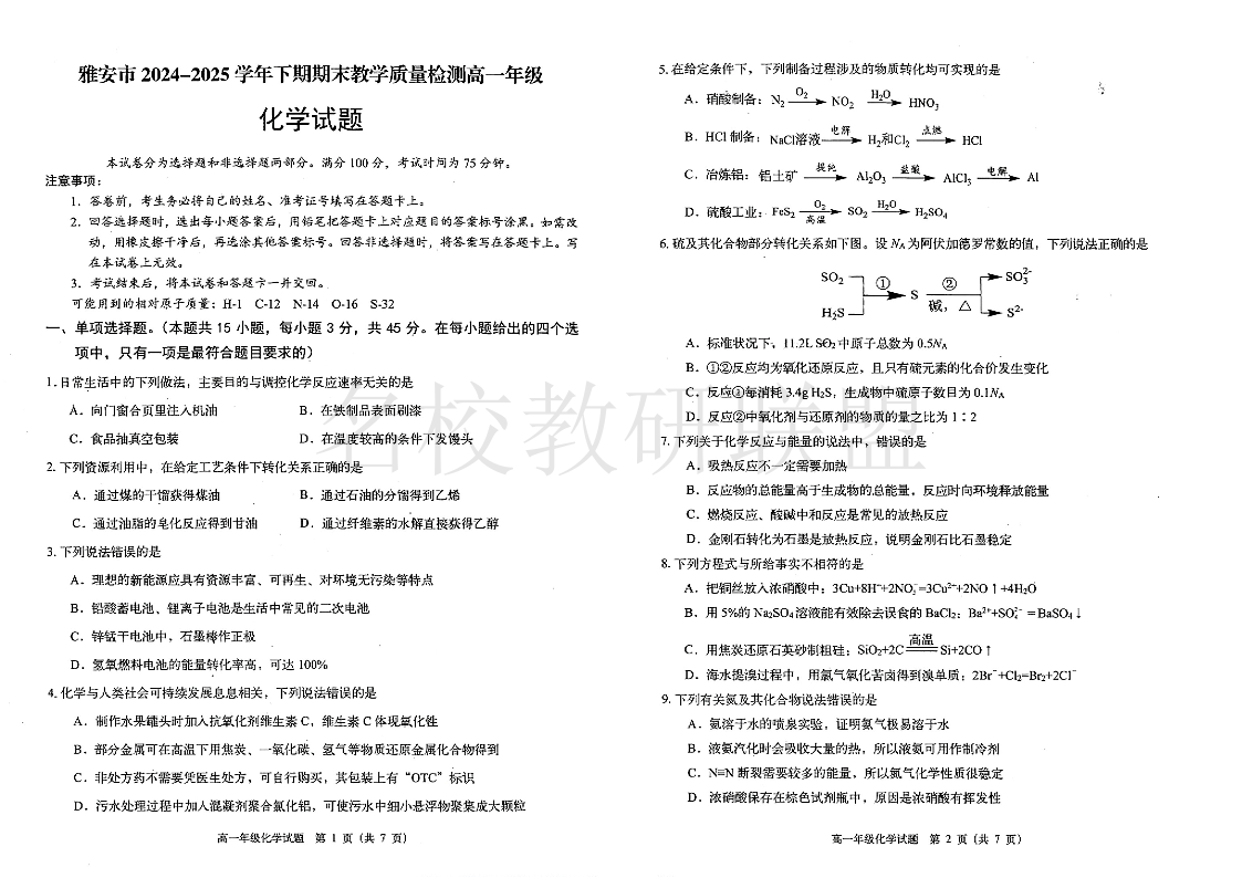 四川省雅安市2024-2025学年高一下学期期末教学质量检测 化学试卷(含答案).pdf