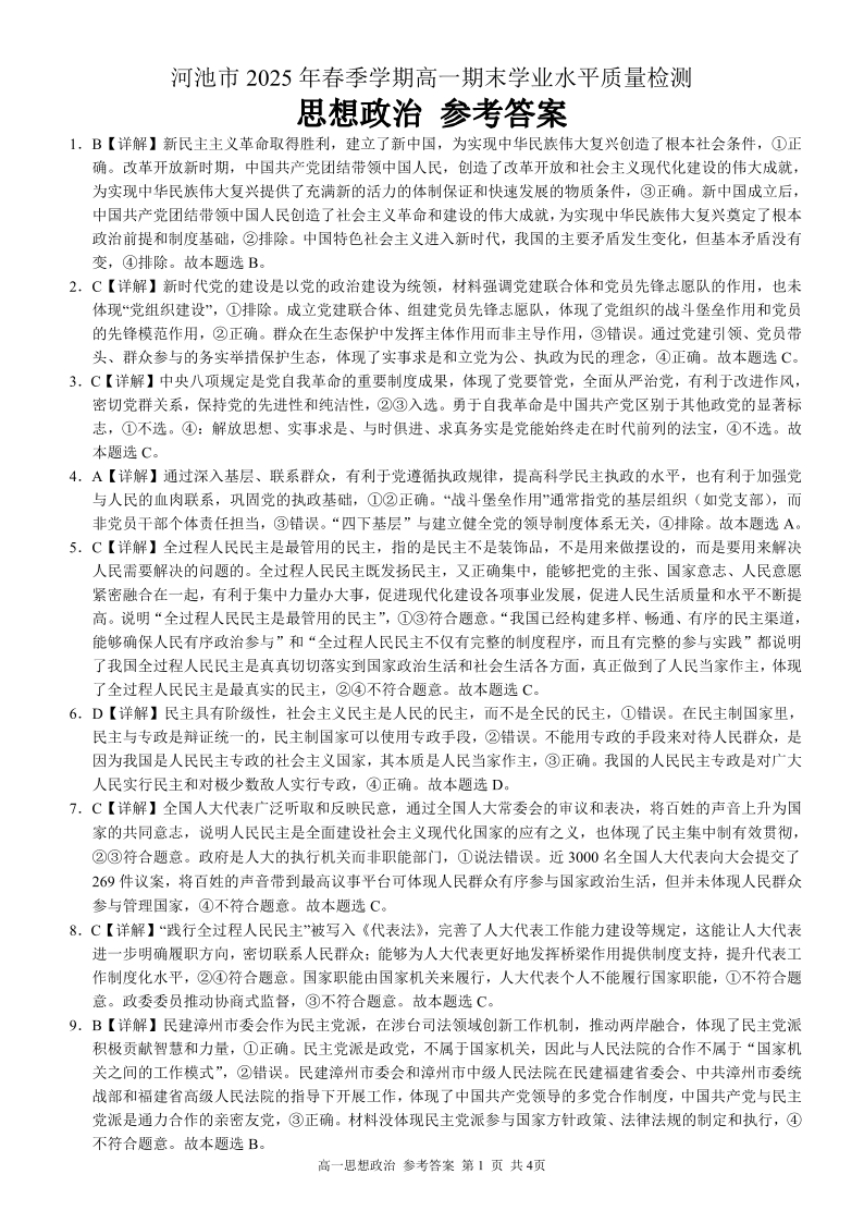 广西壮族自治区河池市2025年春季学期高一年级期末学业水平质量监测 政治答案.pdf