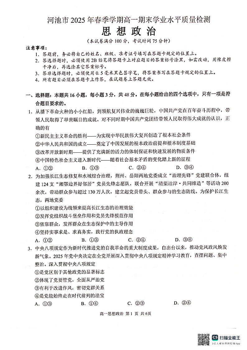 广西壮族自治区河池市2025年春季学期高一年级期末学业水平质量监测 政治.pdf