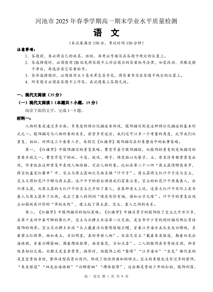 广西壮族自治区河池市2025年春季学期高一年级期末学业水平质量监测 语文.pdf