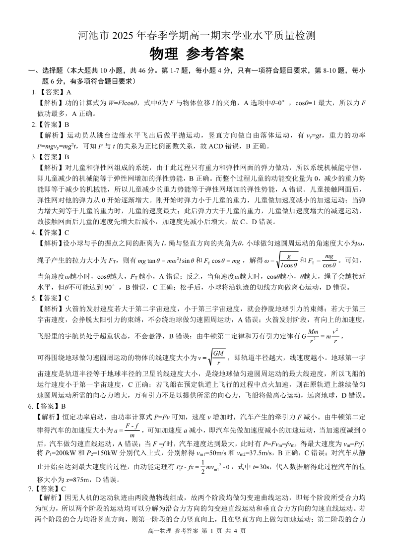 广西壮族自治区河池市2025年春季学期高一年级期末学业水平质量监测 物理答案.pdf