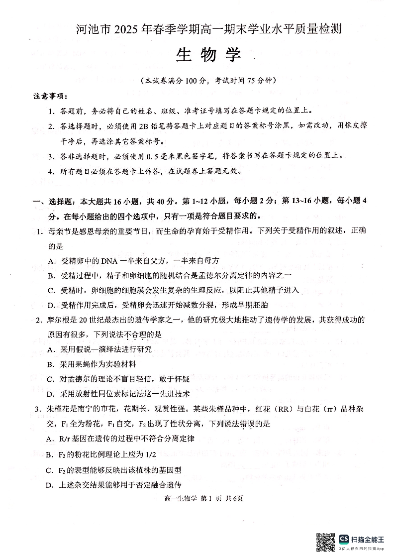 广西壮族自治区河池市2025年春季学期高一年级期末学业水平质量监测 生物.pdf