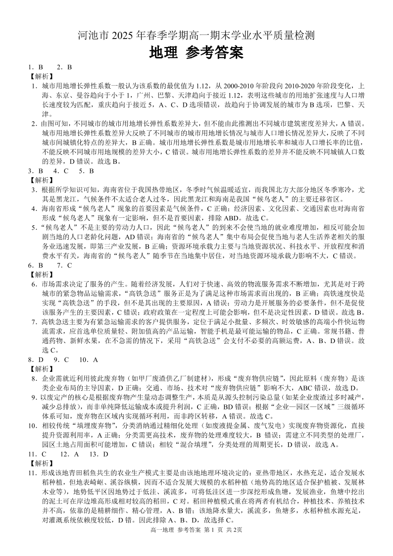 广西壮族自治区河池市2025年春季学期高一年级期末学业水平质量监测 地理答案.pdf