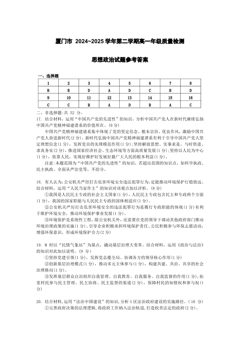 福建省厦门市2024-2025学年第二学期高一年级期末质量检测 政治答案.pdf