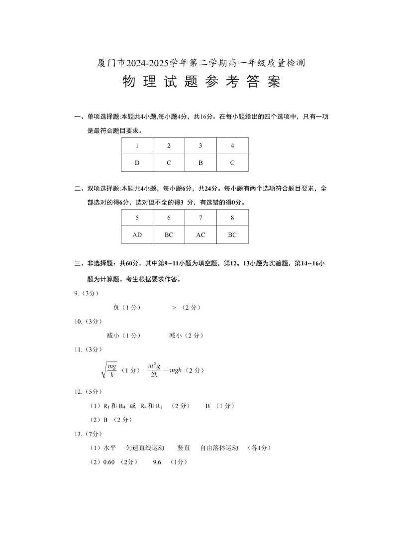 福建省厦门市2024-2025学年第二学期高一年级期末质量检测 物理答案.pdf