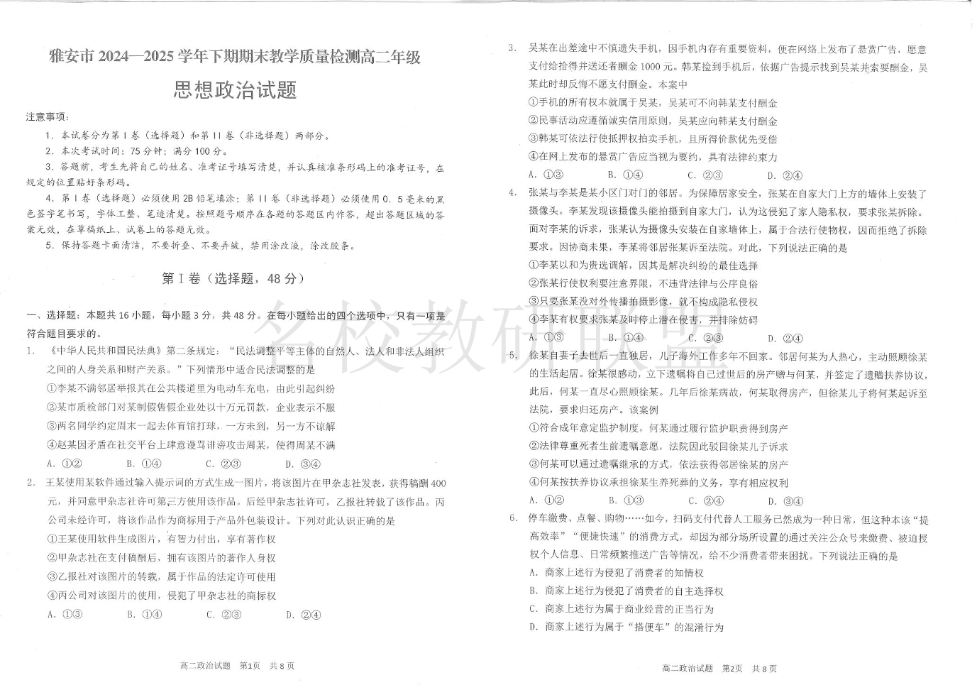 四川省雅安市2024-2025学年高二下学期期末教学质量检测 政治试卷(含答案).pdf
