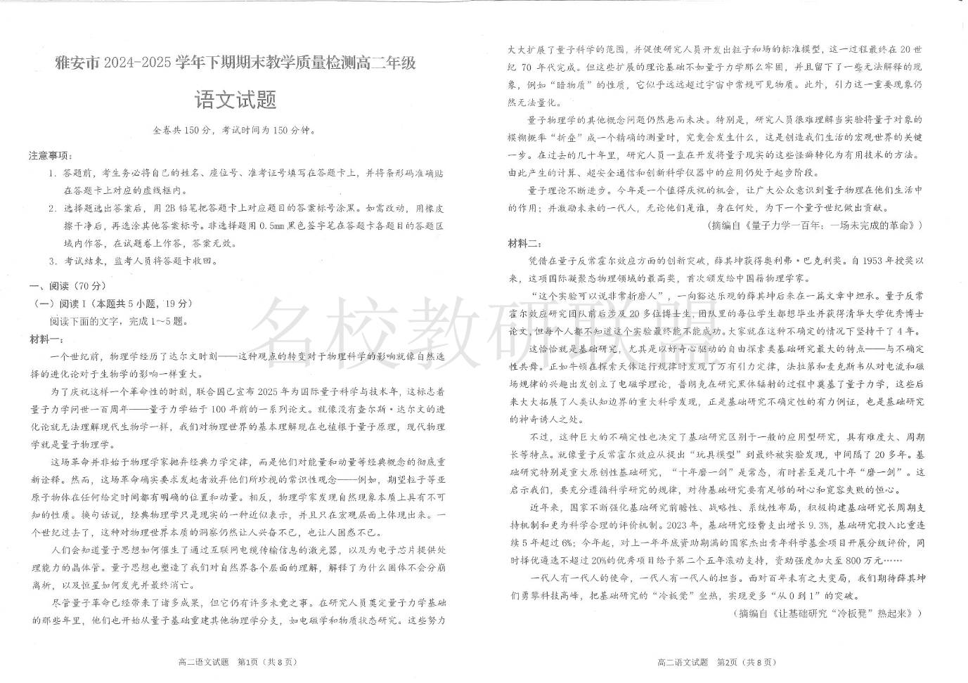 四川省雅安市2024-2025学年高二下学期期末教学质量检测 语文试卷(含答案).pdf