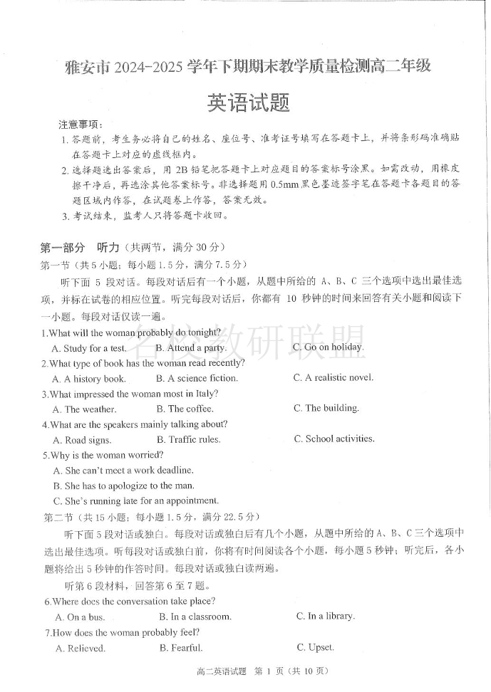 四川省雅安市2024-2025学年高二下学期期末教学质量检测 英语试卷(含答案).pdf