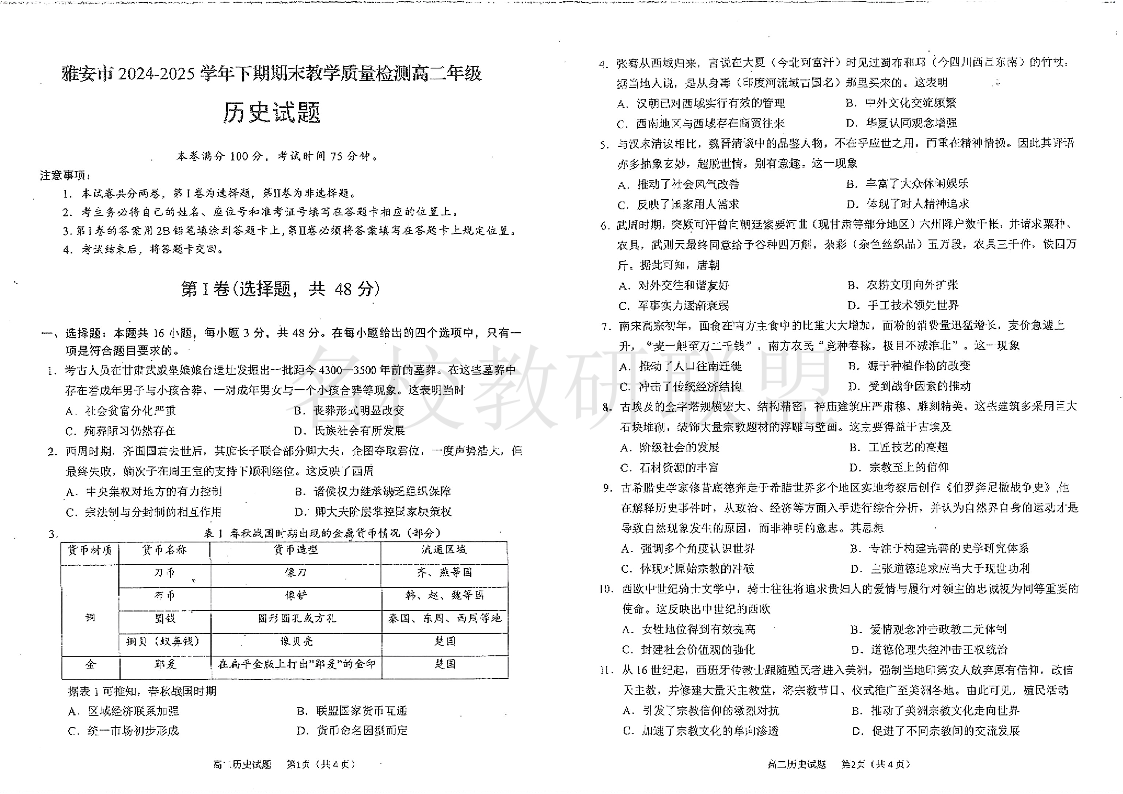 四川省雅安市2024-2025学年高二下学期期末教学质量检测 历史试卷(含答案).pdf