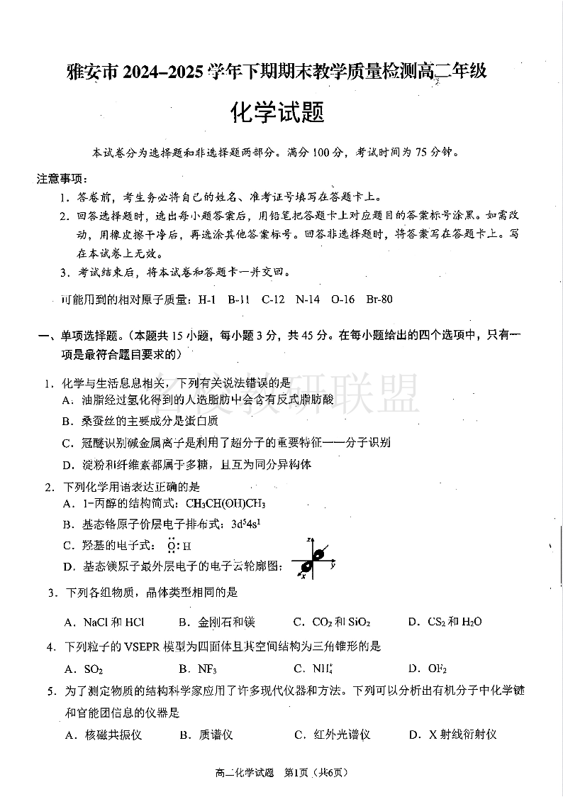 四川省雅安市2024-2025学年高二下学期期末教学质量检测 化学试卷(含答案).pdf
