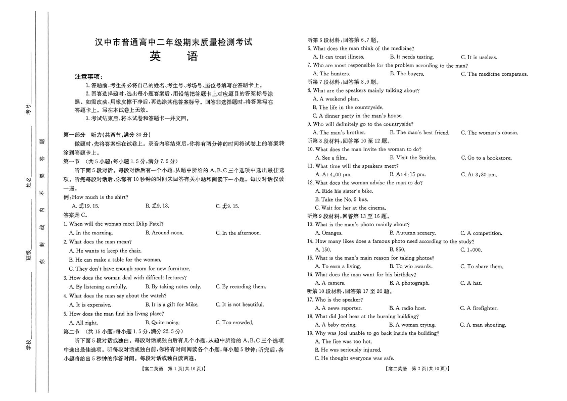 陕西省汉中市2024-2025学年高二下学期期末质量检测考试 英语试卷(含答案).pdf