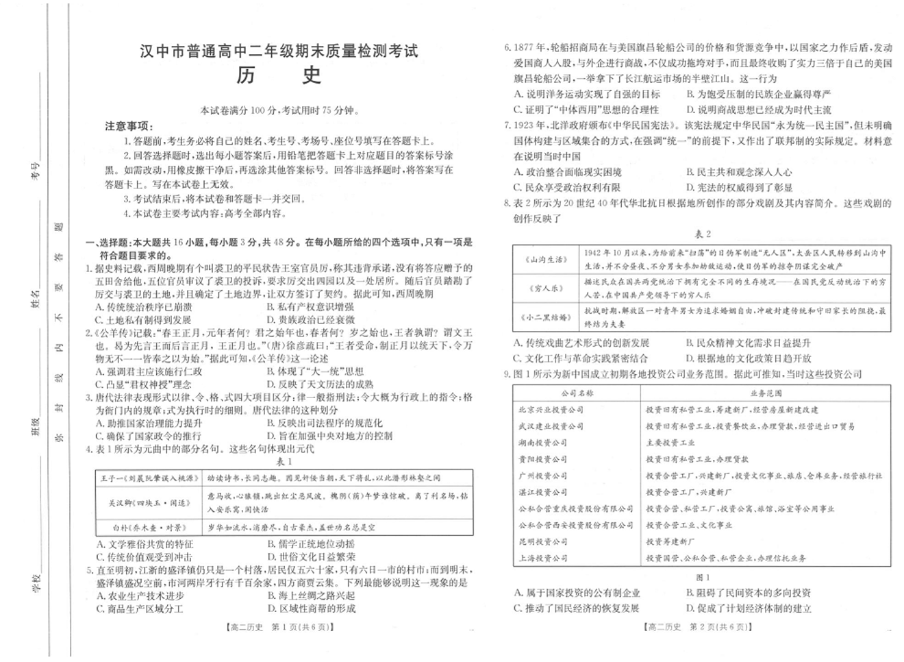 陕西省汉中市2024-2025学年高二下学期期末质量检测考试 历史试卷(含答案).pdf