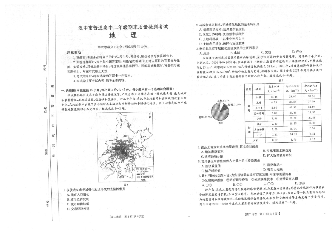 陕西省汉中市2024-2025学年高二下学期期末质量检测考试 地理试卷(含答案).pdf