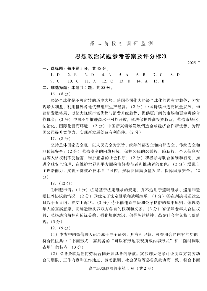 山东省潍坊市2026届高二阶段性调研监测 政治答案.pdf