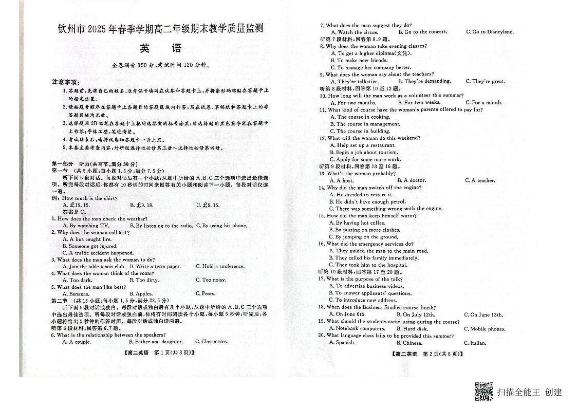 广西壮族自治区钦州市2025年春季学期高二年级期末教学质量监测 英语.pdf