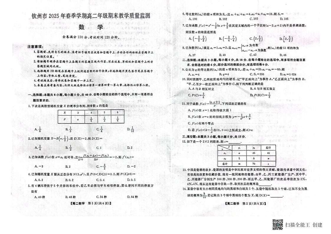 广西壮族自治区钦州市2025年春季学期高二年级期末教学质量监测 数学.pdf