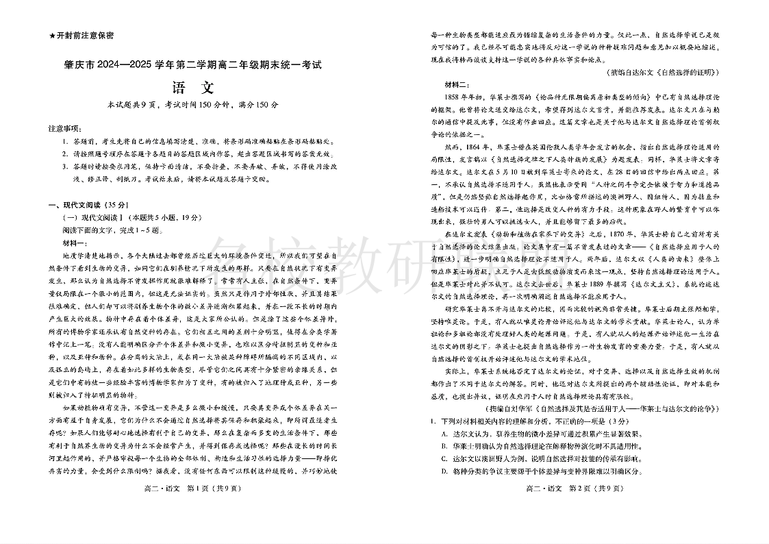 肇庆市2024-2025学年高二下学期期末统一考试 语文(含答案).pdf