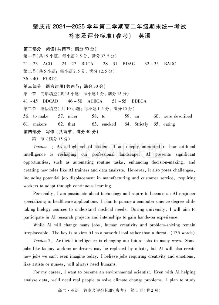 肇庆市2024-2025学年高二下学期期末统一考试 英语答案.pdf
