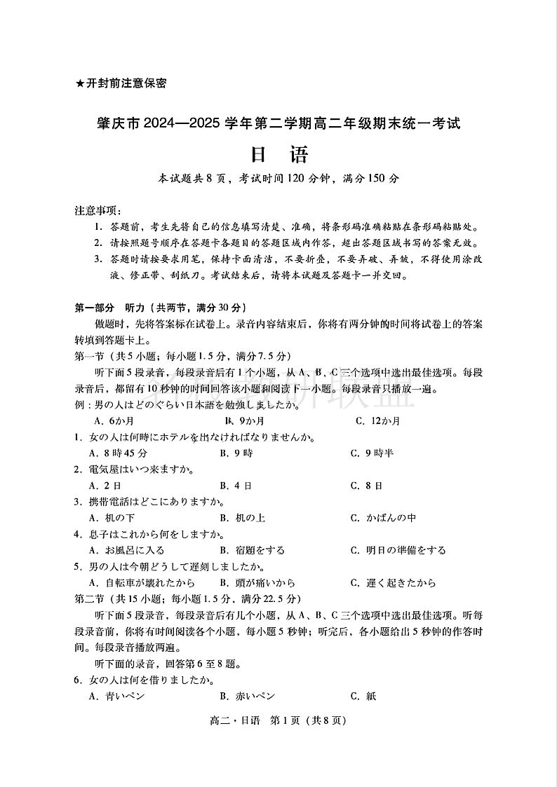 肇庆市2024-2025学年高二下学期期末统一考试 日语.pdf