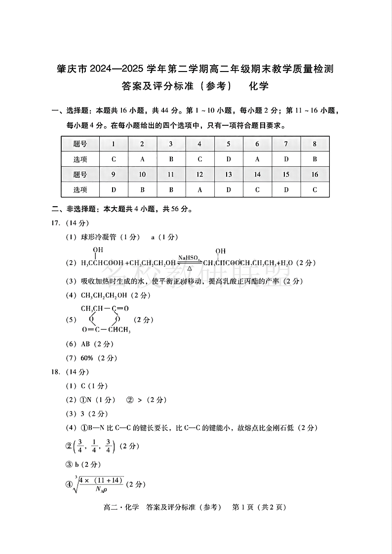肇庆市2024-2025学年高二下学期期末统一考试 化学答案.pdf