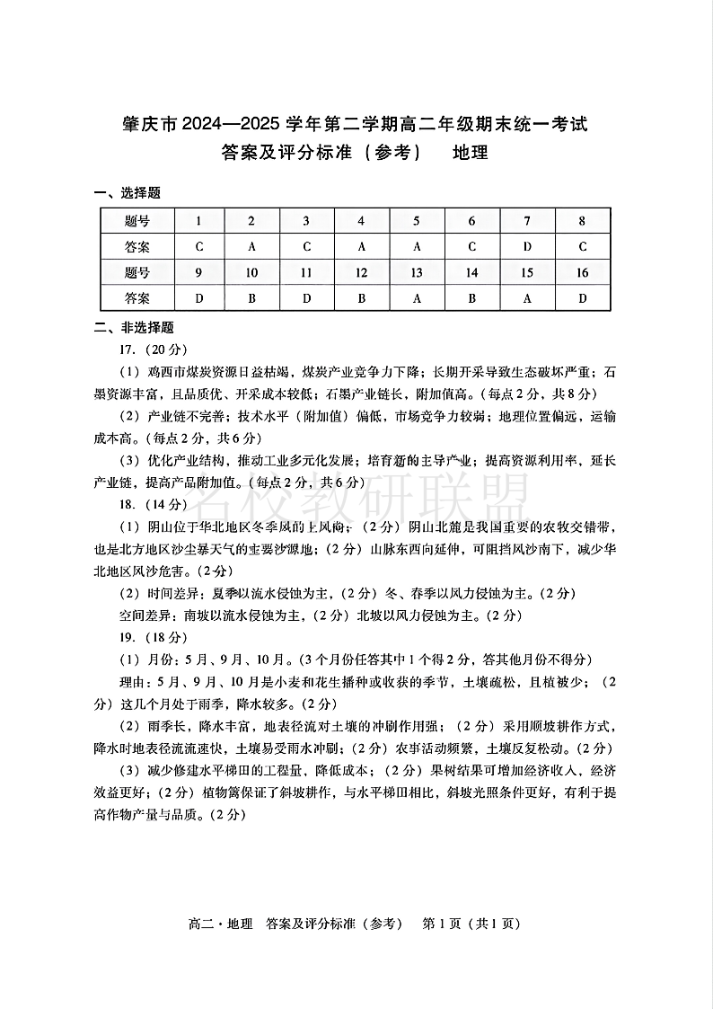 肇庆市2024-2025学年高二下学期期末统一考试 地理答案.pdf