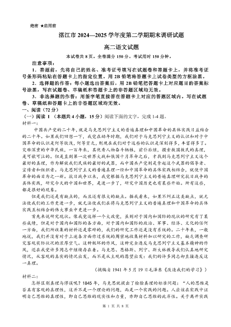 广东省湛江市2024-2025学年高二下学期期末调研测试 语文试卷(含答案).pdf