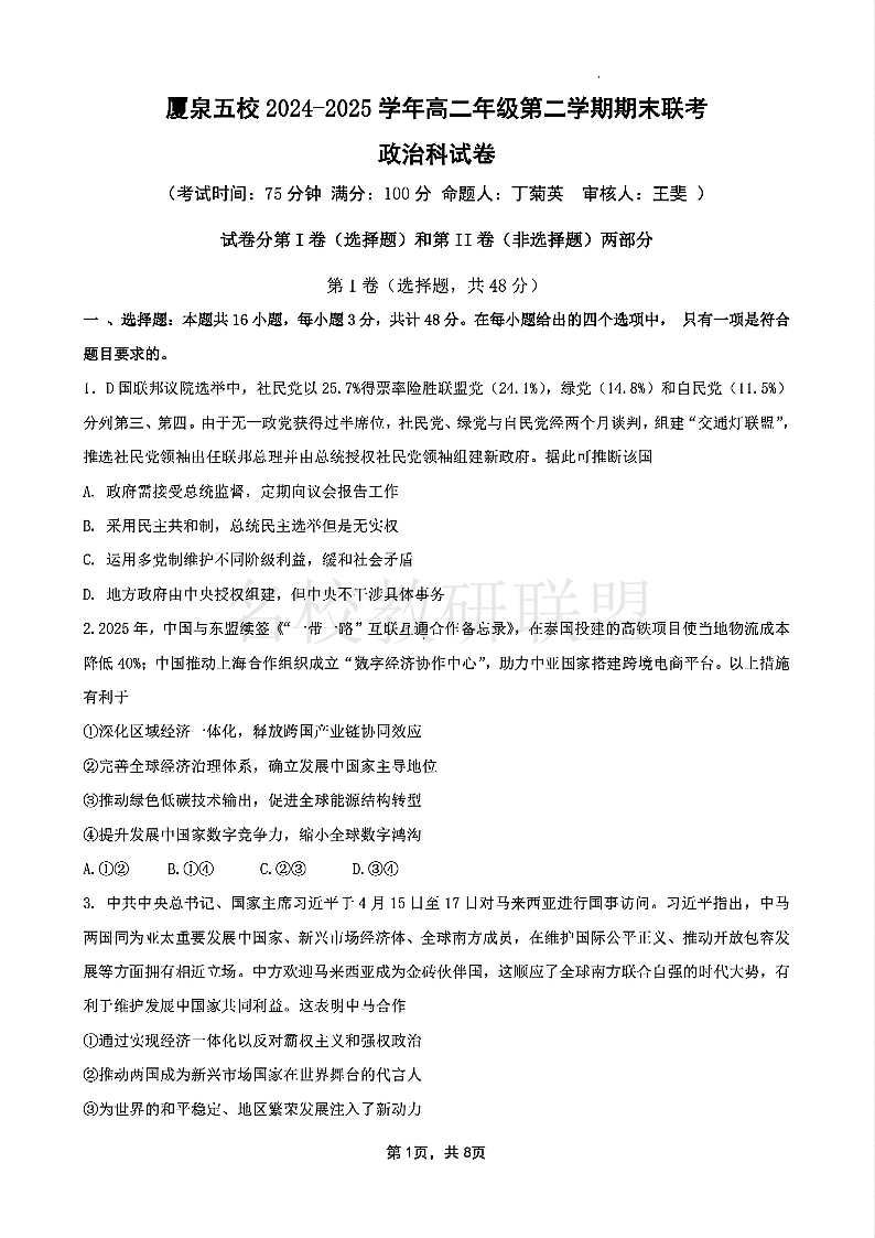 厦泉五校2024-2025学年高二年级第二学期期末联考 政治.pdf