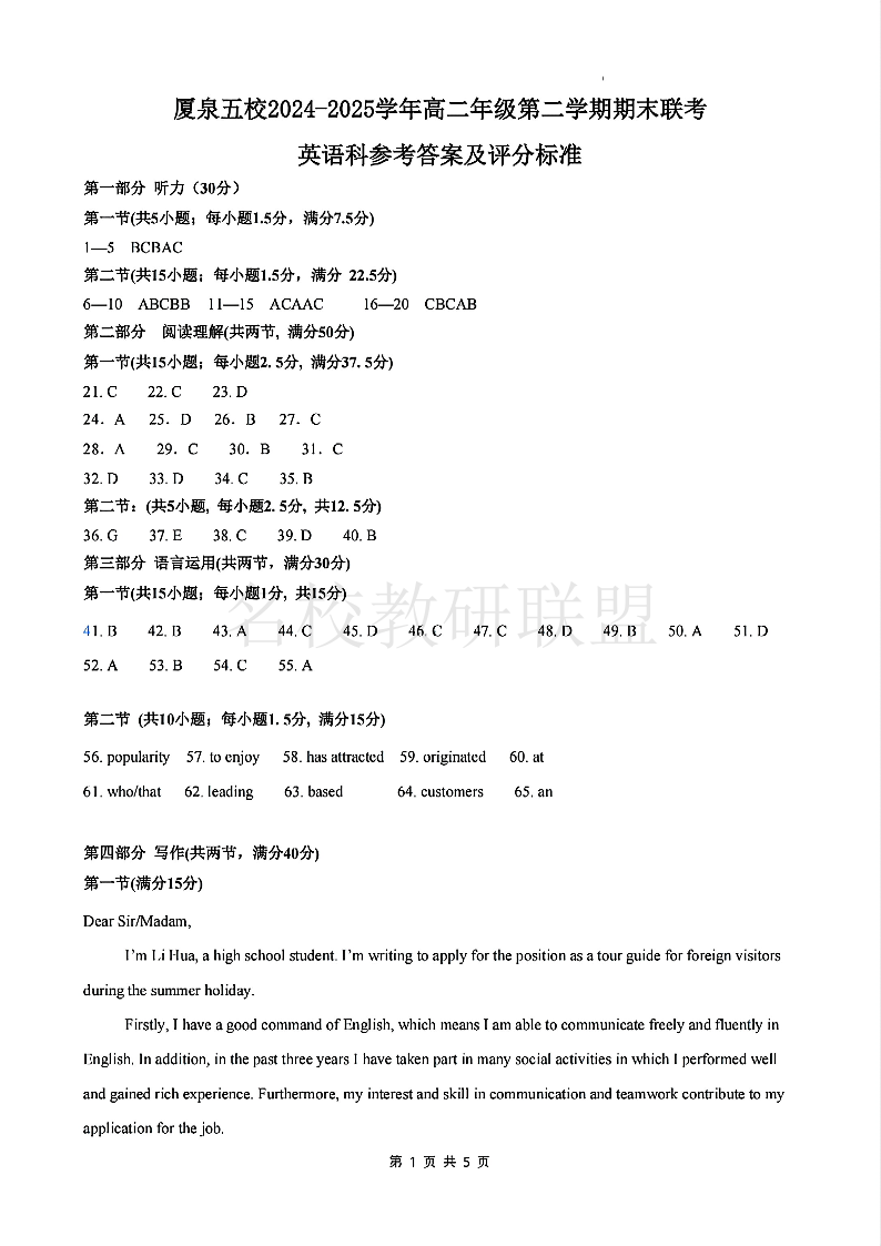 厦泉五校2024-2025学年高二年级第二学期期末联考 英语答案.pdf