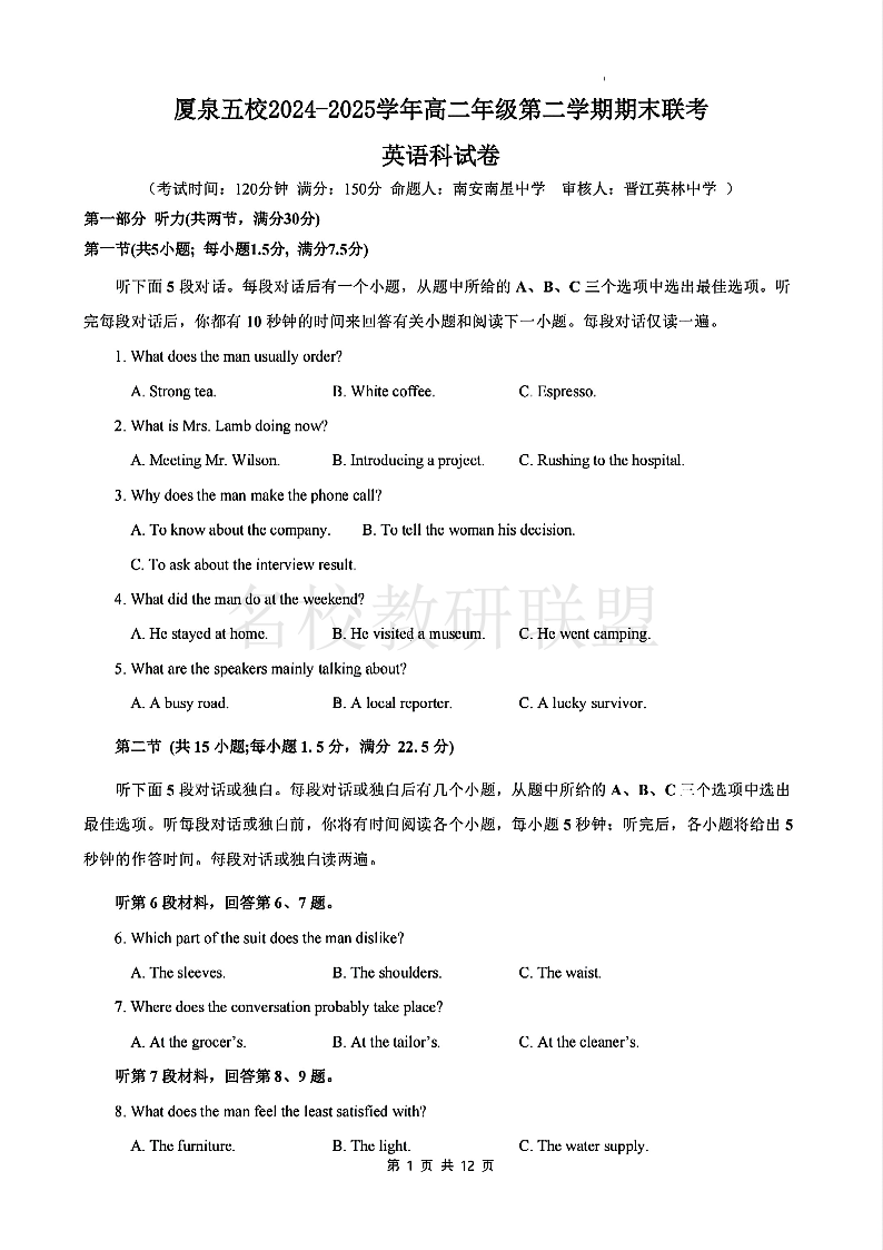 厦泉五校2024-2025学年高二年级第二学期期末联考 英语.pdf