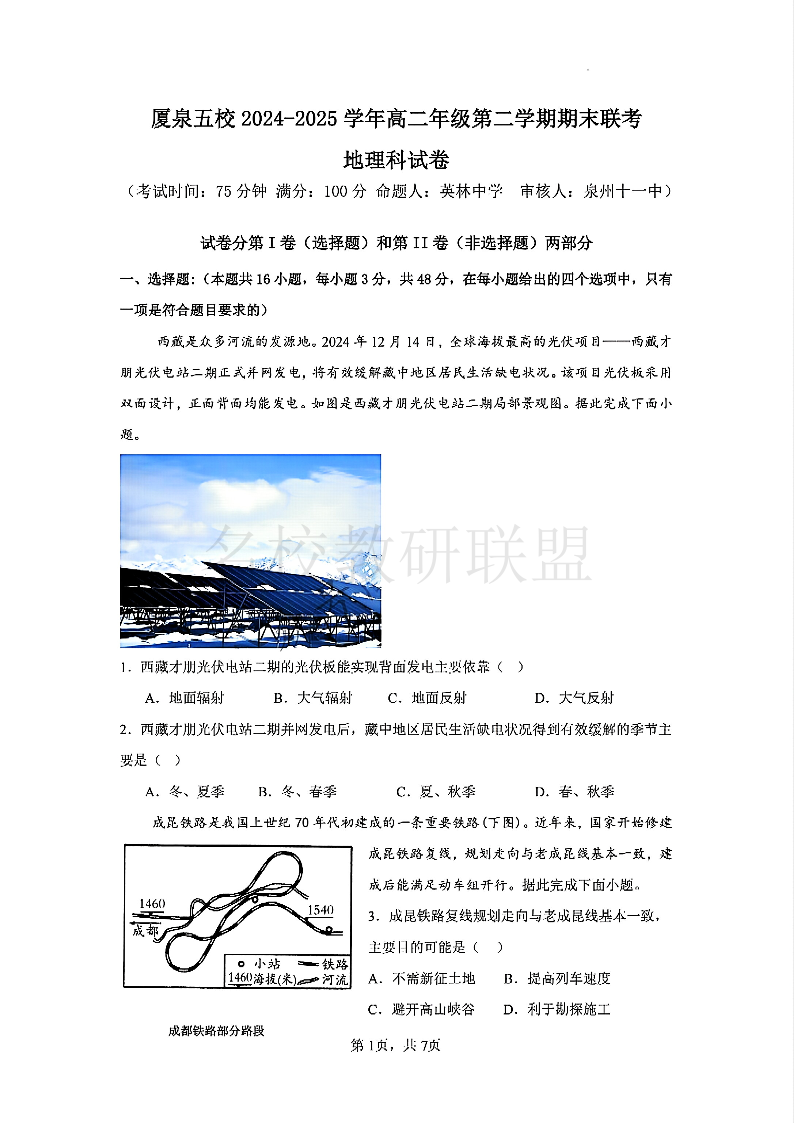 厦泉五校2024-2025学年高二年级第二学期期末联考 地理.pdf