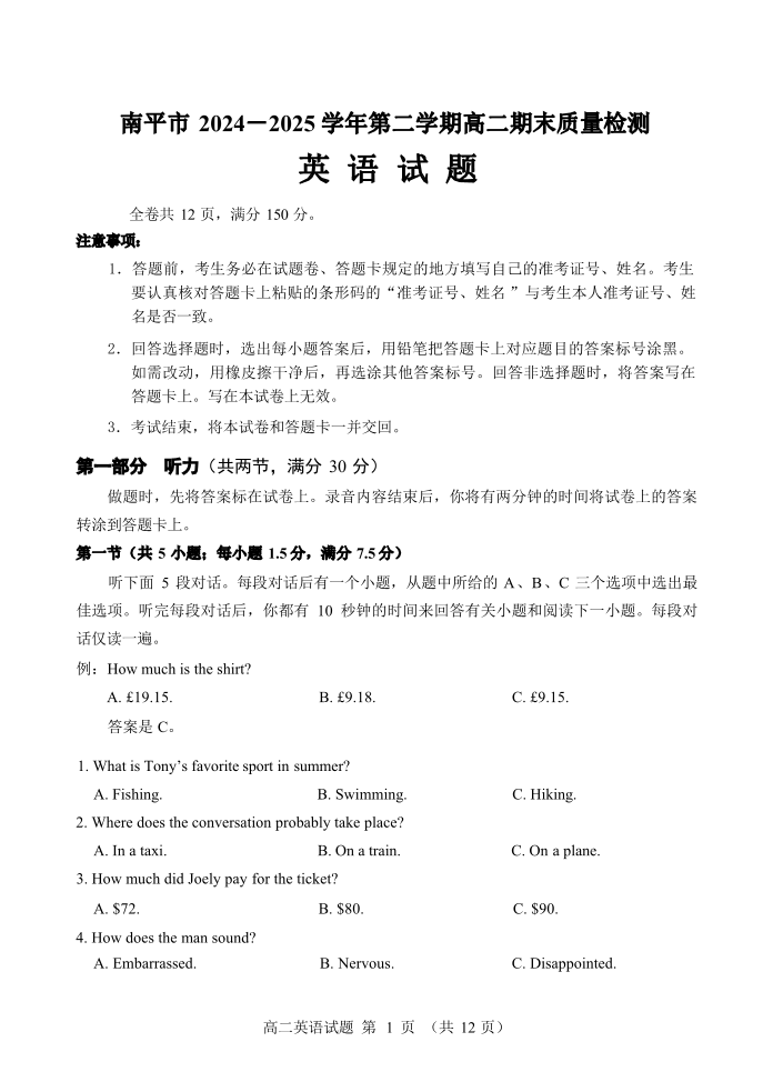 福建省南平市2024-2025学年第二学期高二期末质量检测 英语试卷(含答案).pdf