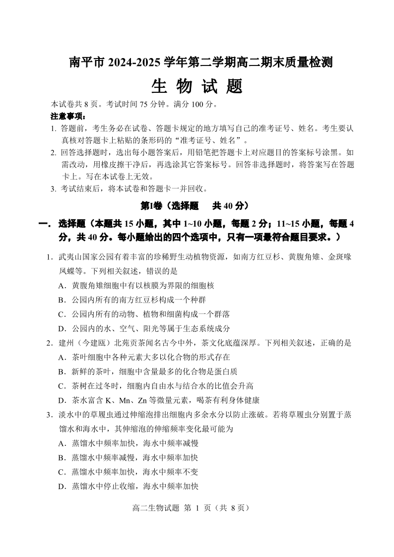 福建省南平市2024-2025学年第二学期高二期末质量检测 生物试卷(含答案).pdf