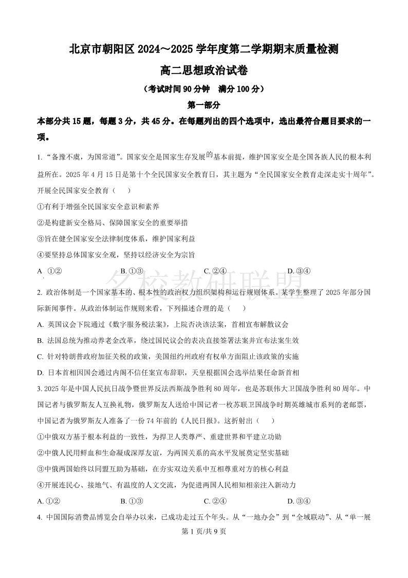 北京市朝阳区2024-2025学年高二下学期期末质量检测 政治试卷(含答案).pdf