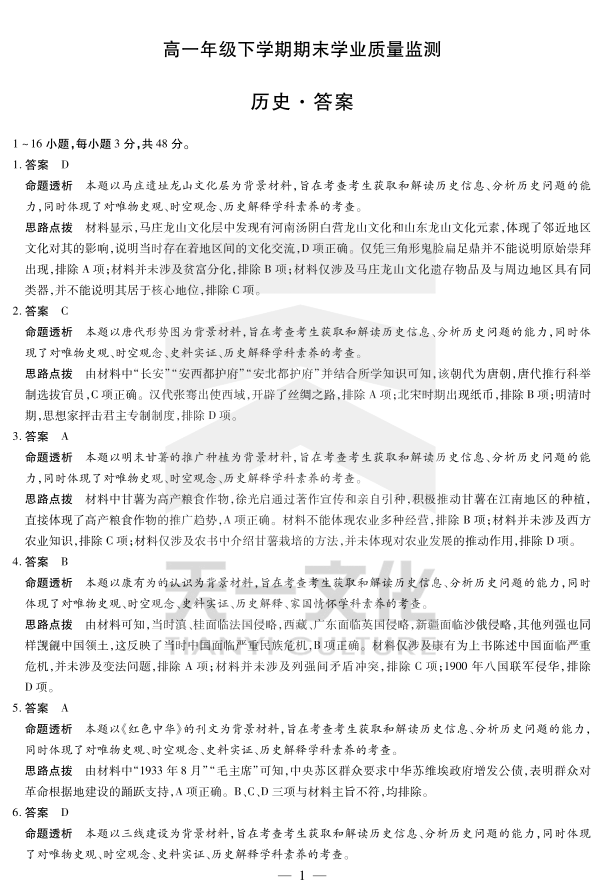 历史高一下期末学业质量监测答案.pdf