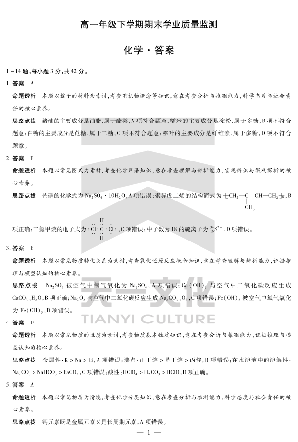 化学高一下期末学业质量监测答案.pdf