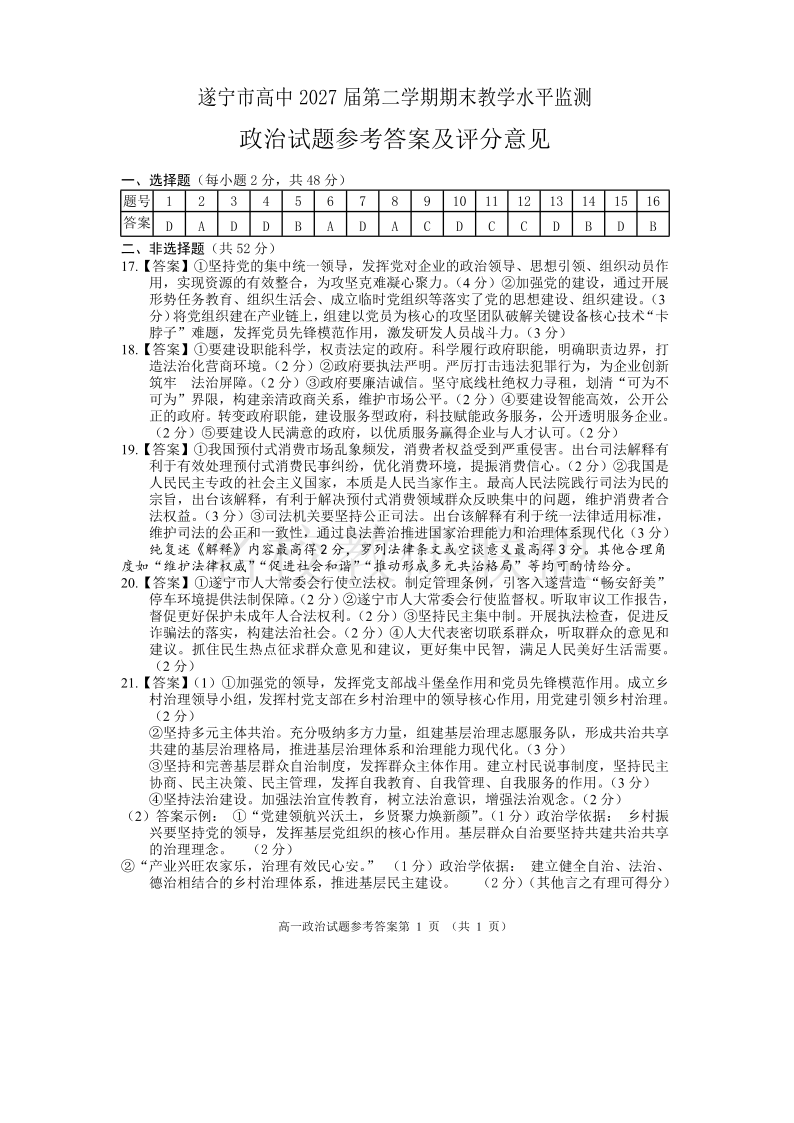 四川省遂宁市2024-2025学年高一下学期期末考试 政治答案.pdf