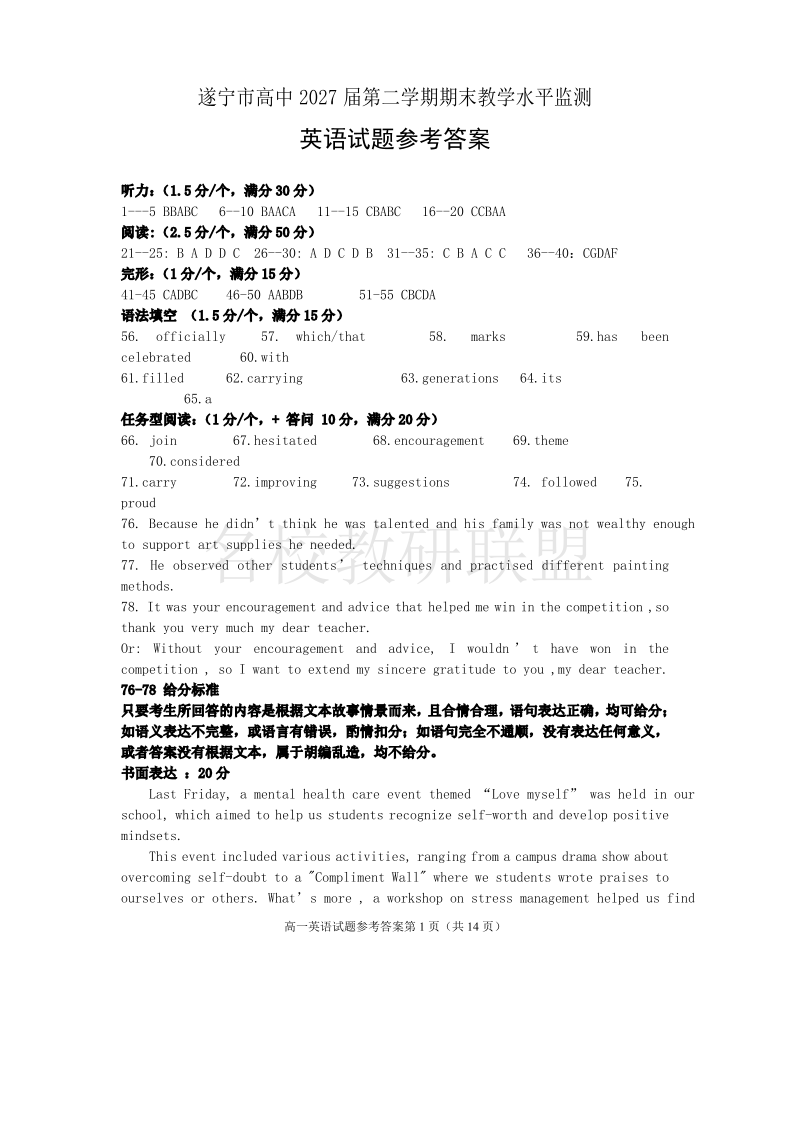 四川省遂宁市2024-2025学年高一下学期期末考试 英语答案.pdf