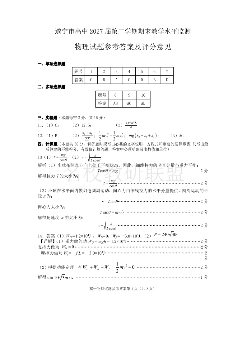 四川省遂宁市2024-2025学年高一下学期期末考试 物理答案.pdf