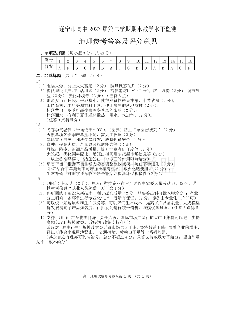 四川省遂宁市2024-2025学年高一下学期期末考试 地理答案.pdf