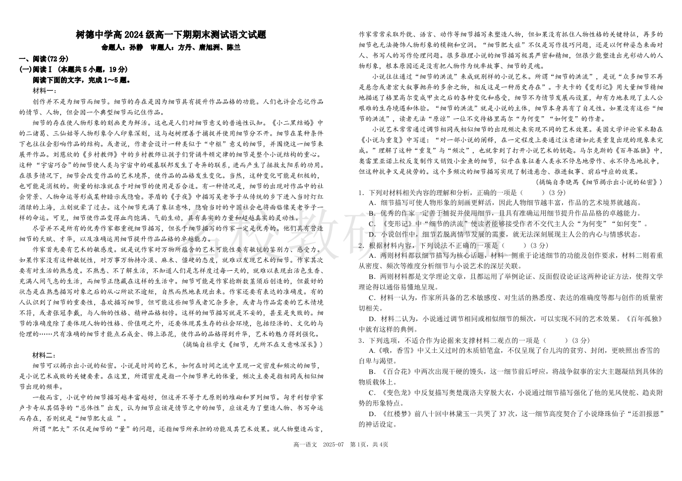 四川省成都市树德中学2024-2025学年高一下学期期末考试 语文试卷(含答案).pdf