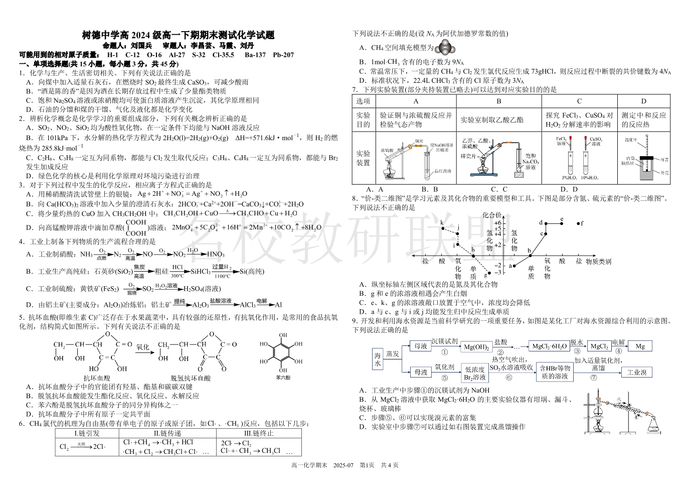 四川省成都市树德中学2024-2025学年高一下学期期末考试 化学试卷(含答案).pdf