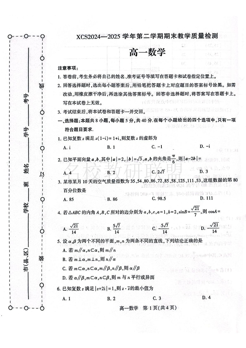 河南省许昌市2024-2025学年高一下学期期末教学质量检测 数学.pdf