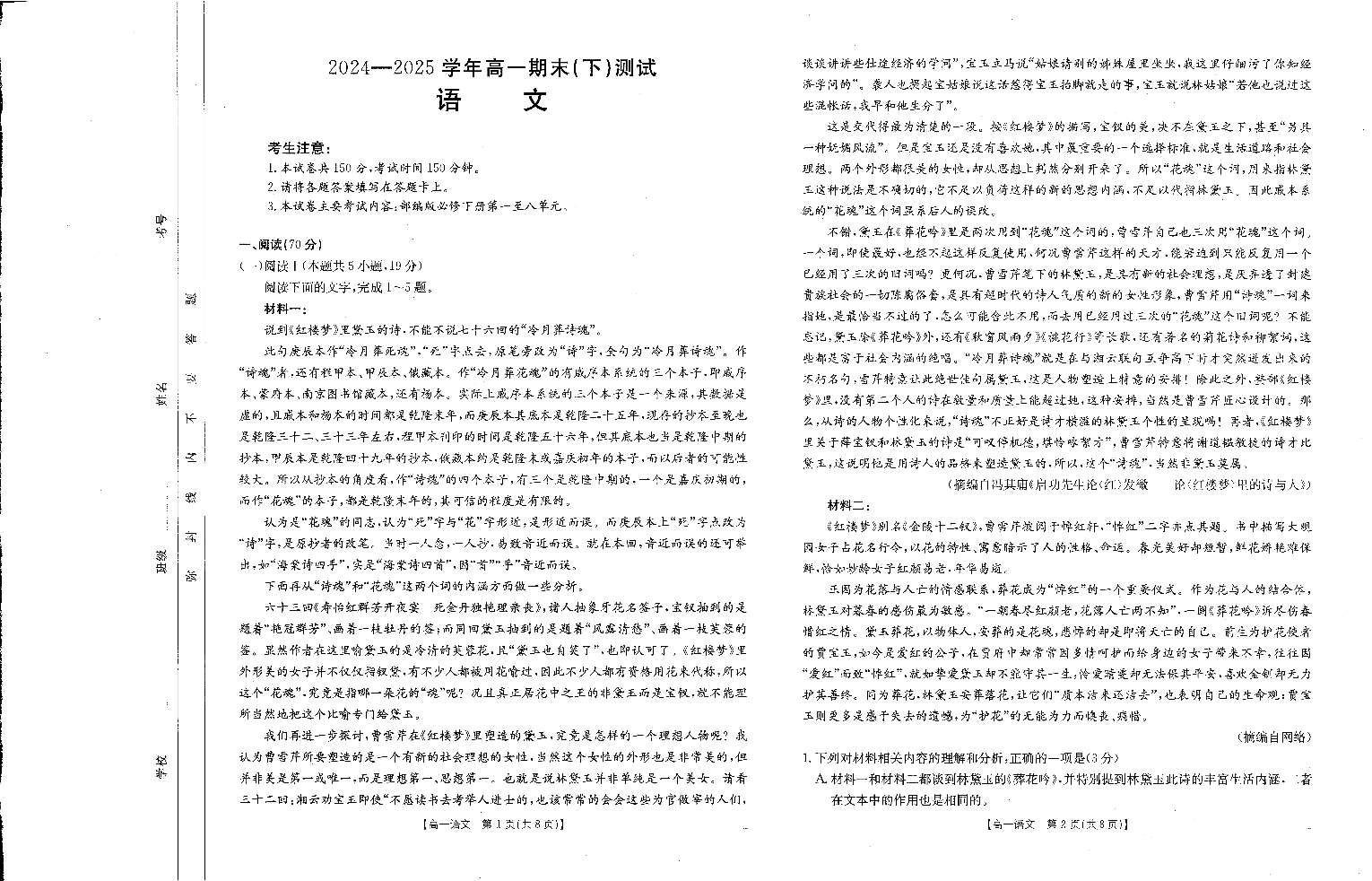 河南新乡2024-2025学年下学期高一语文试卷(期末考试).pdf