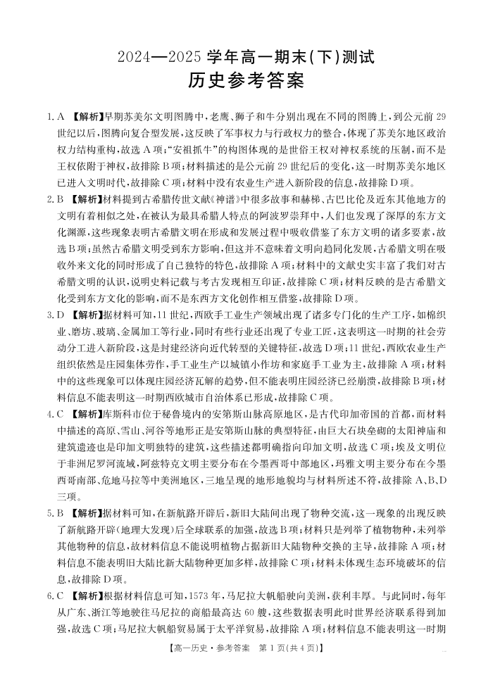 河南新乡2024-2025学年下学期高一历史试卷(期末考试)答案.pdf